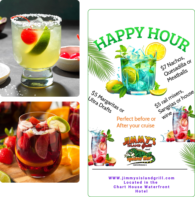 Experience vibrant, Key West-inspired dining at Jimmy’s Island Grill, located at The Charthouse Marina Hotel on world-famous Clearwater Beach. Whether you’re grabbing a bite by the pool or dining along the marina, every seat comes with a stunning waterfront view and an inviting coastal breeze.